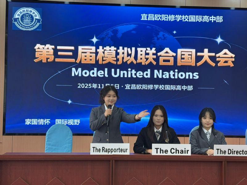 宜昌歐陽(yáng)修學(xué)校國(guó)際高中部第三屆MUN模擬聯(lián)合國(guó)大會(huì)于2025年11月5日晚在教學(xué)樓五樓大會(huì)議室隆重舉行,國(guó)際高中部OSSD中加班的11位模聯(lián)主席團(tuán)成員以及來(lái)自高一年級(jí)的24位優(yōu)秀代表扮演各個(gè)國(guó)家的外交官,全英文闡述有關(guān)UAV無(wú)人機(jī)的管控意見(jiàn),給全校師生展示了英語(yǔ)學(xué)習(xí)的趣味性和現(xiàn)實(shí)意義?! ?br /> 眾所周知,高效課堂學(xué)習(xí)方式的核心和靈魂就是體驗(yàn)和運(yùn)用。MUN模擬聯(lián)合國(guó)是一種難度適中的外交角色扮演活動(dòng),目的在于訓(xùn)練學(xué)生像聯(lián)合國(guó)官員一樣寫(xiě)作、像新聞發(fā)言人一樣演講、像外交官一樣溝通磋商談判,是一種卓有成效的領(lǐng)導(dǎo)力教育形式,是無(wú)聲的立志教育。